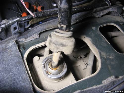 | далее, отсоединяем рычаг раздатки...переводим его заранее в положение N (нейтраль)..так удобнее с ним работать...снимаем стопорное колечко, тянем рычаг вверх и он у нас в руках...стопорное колечко видно на фото... режем посередине в месте изгиба рычага...и привариваем заново...привариваем так чтобы он сместился назад и правее... на рычаге раздатки порвали чехол резиновый - пыльнык...сколхозили из двух...вот этот пыльник порвали... для чего это нужно..из-за подъема кузова (так как рычаг у нас на раздатке, а она на раме), то нет возможности включать разные режимы..рычаг упирается в кузов....фото не мое...четвертое..чет не выкладывается...админ подправит если че...