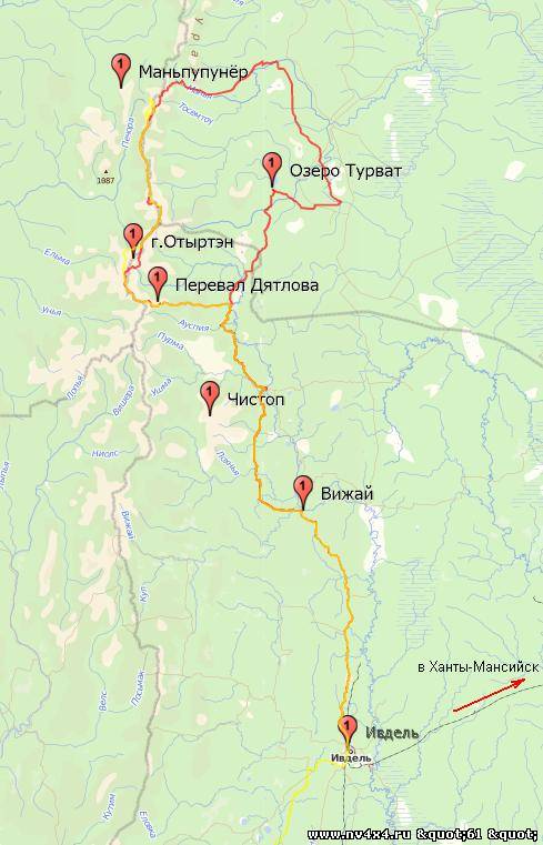 Взял два трека у тех, кто уже ездил на пупы. Основная дорога на картинке - это где желтый и красный треки идут рядом. Красный трек - это парни из Екатеринбурга ездили на Макарах (в интернете поищите, если интересно). Но как они мне сказали, на внедорожниках там вполне проезжабельно и можно попасть на красивое озеро (Турват). По обоим трекам путь от Ивделя до Пупов занимал 3-4 дня.