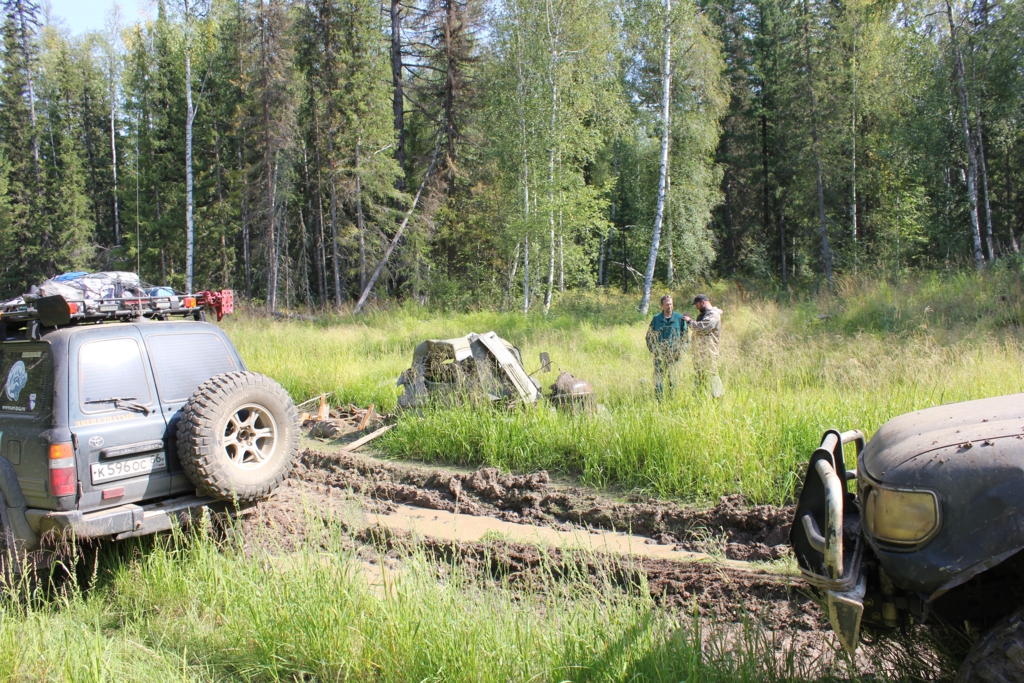 Маршрут достаточно интересный и сложный. Думаю, что команда из чуть менее надежных машин будет преодолевать его дольше, поскольку даже 80-ки на 38 колесах работали на пределе. У нас рвались троса на лебедках несколько раз. У 12го рвало шпонку на кардане лебедки, у меня вырывало заделку троса так, что пришлось модернизировать барабан для более качественной и простой заделки троса. Были еще несколько мелких ремонтов, но это мелочи (порванный тормозной шланг, замена щеток генератора, правка колесного диска после наезда на пень, ремонт рогов для намотки троса, промывка системы охлаждения, принудительное заклинивание вискомуфты). Для примера скажу, что поездка на Пупы показалась нам намного более простой, чем эта экспедиция, хотя и там много машин ломались серьезно.