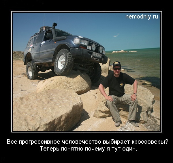 | Ну, не любой 4х4 автомобиль, конечно, например мерседес S-класса 4матик не подойдет однозначно, да и тойота Кариб и Субары разные тоже. А вот Нивка - самое то, или лучше УАЗка! Кроссоверы всевозможные ... очень жалко пластик, кузовное железо и всевозможные электро-виско- и прочие муфты, которые умирают не доехав до бездорожья....Добавлено (10.06.2015, 18:20) ---------------------------------------------